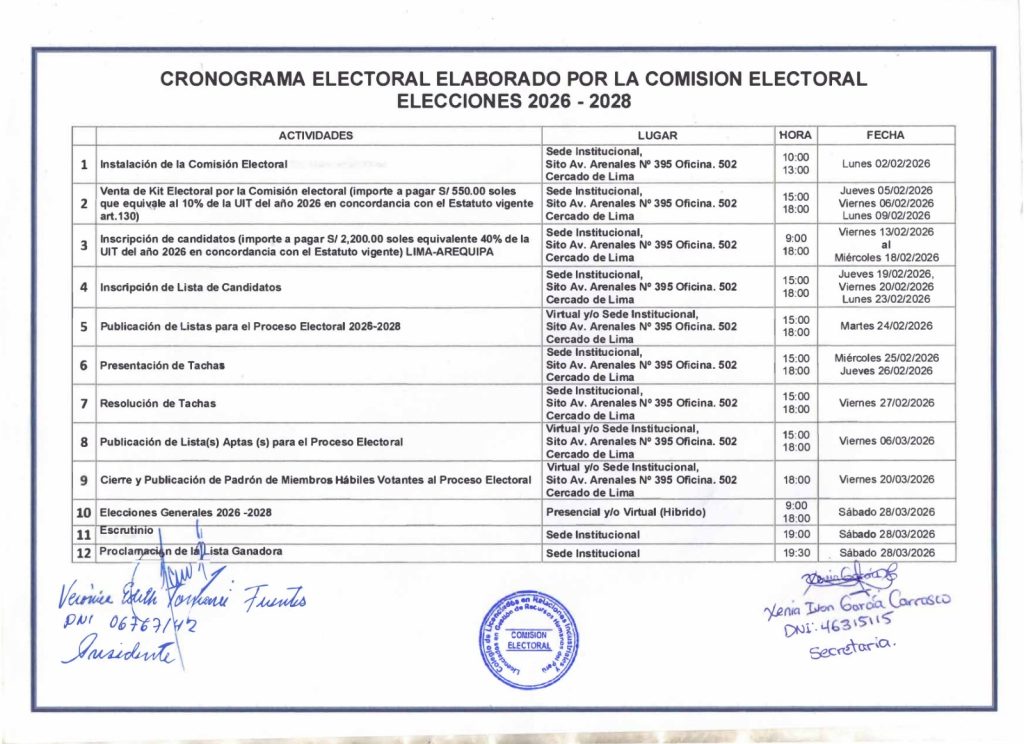 Buenas tardes:Por encargo de la Comisión Electoral 2026-2028, cumplimos con adjuntar el Comunicado N.° 001-2026 y el Cronograma Electoral, elaborados y debidamente aprobados por la referida comisión.Atentamente;