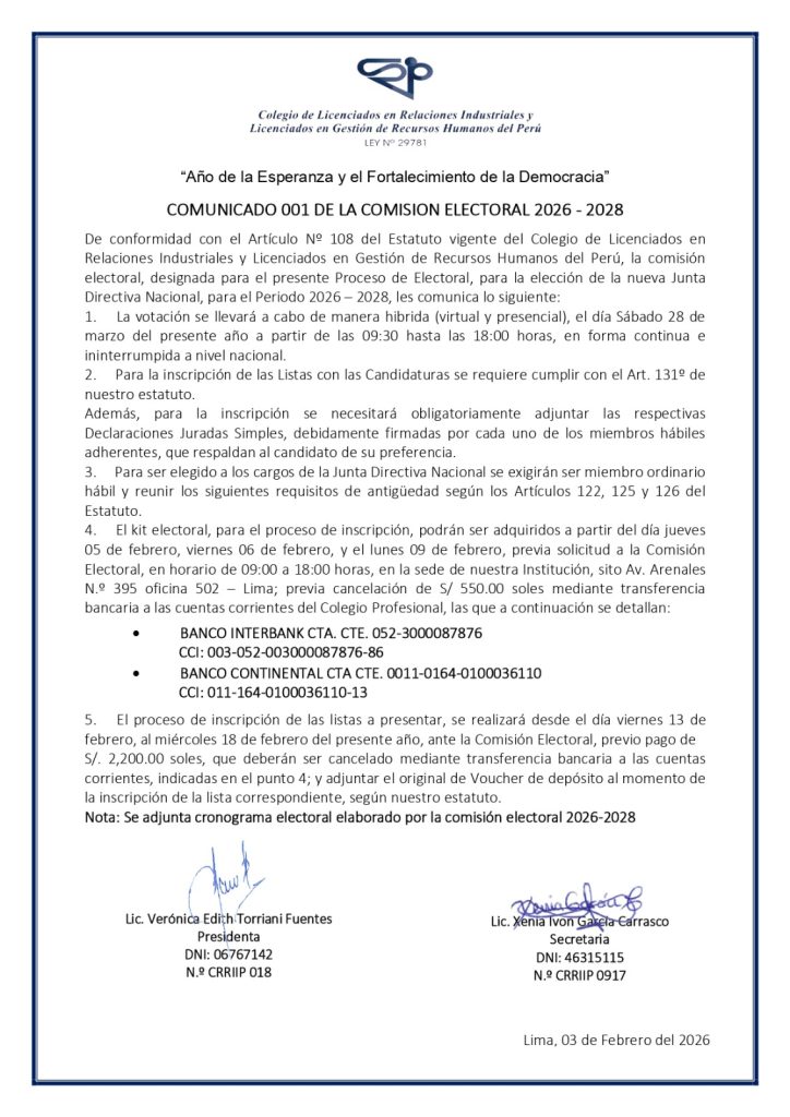 Saludos cordiales,Comisión Electoral 2026-2028Colegio de Lic. RRII y Lic. Rrhh teléfono: (01) 431 3751 Celular y Whatsapp Institucional: 932 983 144 www.crriirrhhp.org.pe