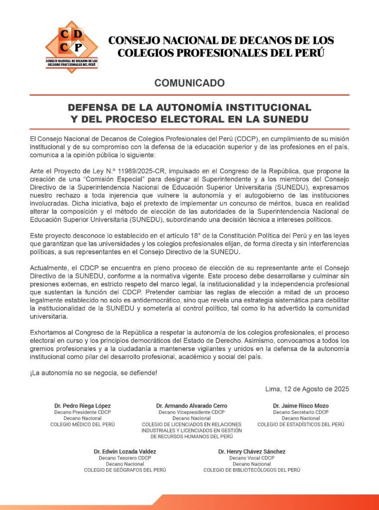 El Consejo Nacional de Decanos de Colegios Profesionales del Perú (CDCP) se pronuncia en defensa de la autonomía institucional y del proceso electoral en curso para elegir su representante ante la SUNEDU, frente a los intentos desmedidos de control político desde algunos sectores del Congreso de la República